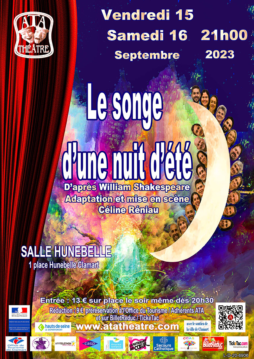 Adaptation inédite du Songe de William Shakespeare : Le duc Thésée et la reine des Amazones sur le point de se marier, quatre amoureux qui ne savent plus qui ils aiment,le roi et la reine des fées en plein conflit, une bande d’artisans, pas très doués, venue répéter une pièce, une reine maléfique, un lutin malicieux, des fées qui chantent et se déhanchent sur de la musique pop… 23 personnages se croisent, se perdent entre rêve et réalité en un chassé-croisé qui s’annonce explosif. Entre burlesque et féerie, tête d’âne et intrigues amoureuses, découvrez la plus célèbre et la plus drôle des comédies de Shakespeare, dans une adaptation et mise en scène poétiques et humoristiques.
